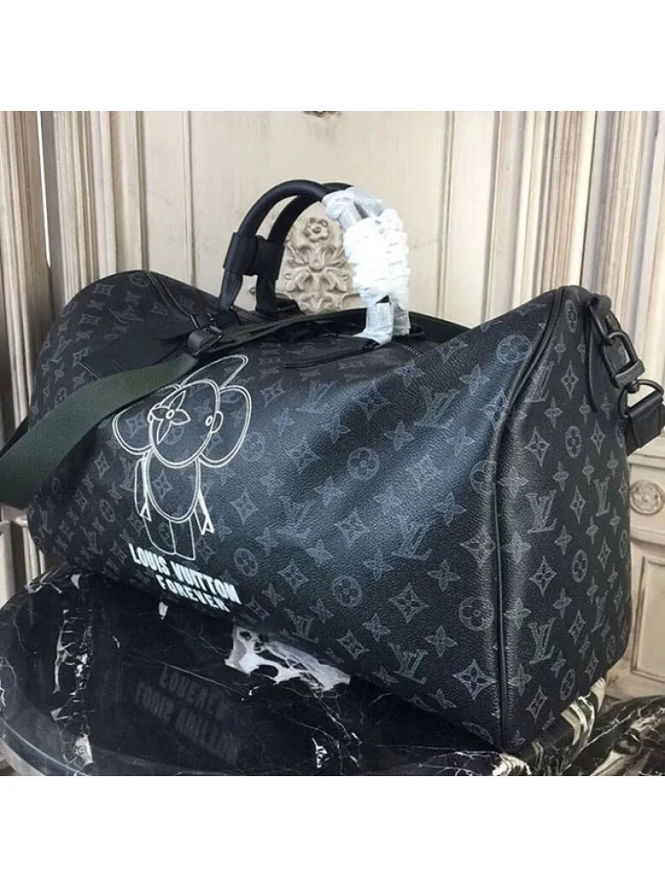 Материалы полностью идентичны оригиналу. Полный комплект. Сумка Louis Vuitton Monogram Eclipse Canvas Keepall Bandouliere 50 M43683 "Black" - стильная и функциональная сумка для путешествий и повседневного использования. Изготовлена из прочного и водонепроницаемого материала с монограммой Louis Vuitton Eclipse. Преимущества товара: