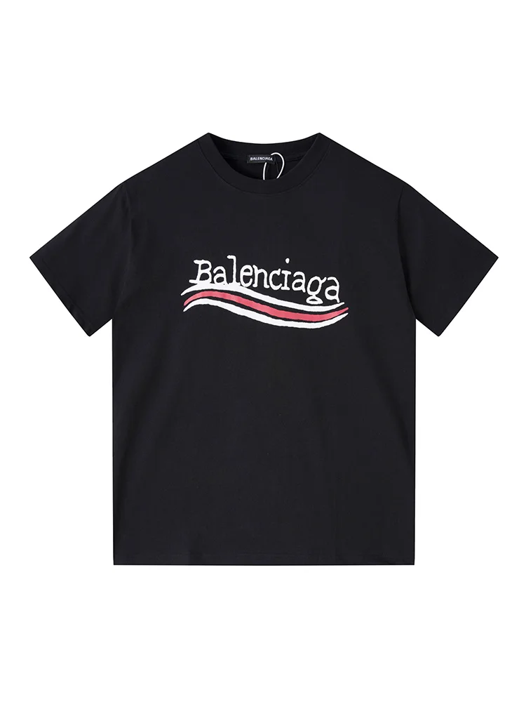 - Стильный дизайн: футболка имеет узнаваемый логотип Balenciaga и оригинальный принт с тремя волнами, добавляющими элегантности и оригинальности вашему образу.