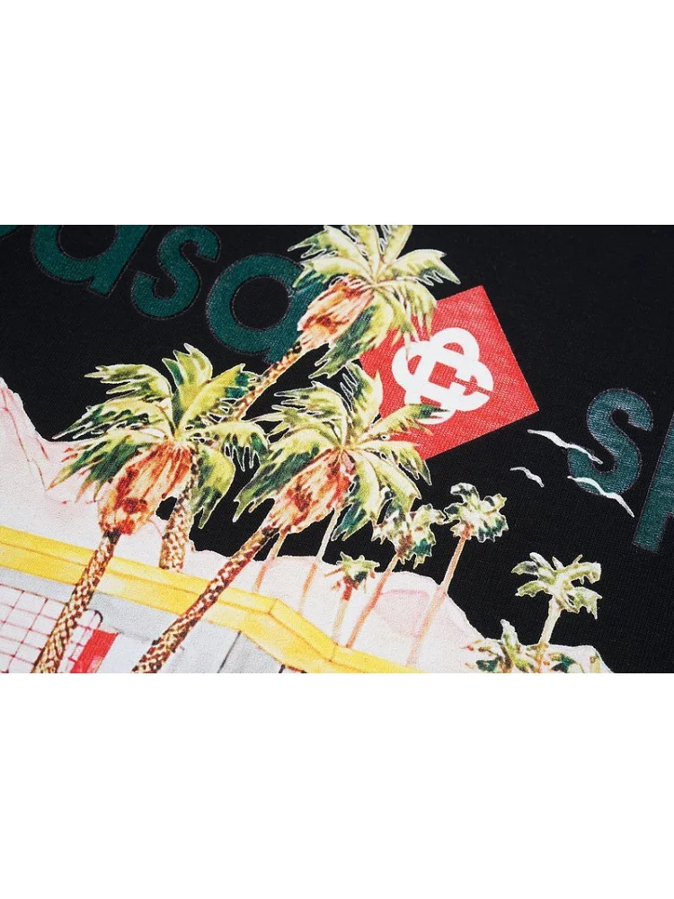- Стильный дизайн: уникальный принт пальмовых деревьев перед зданием придает футболке особый шарм и привлекательность.