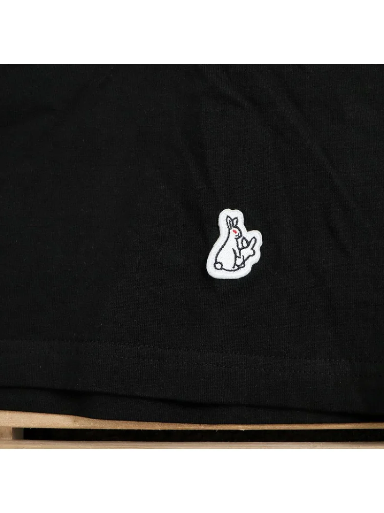 - Стильный дизайн: футболка имеет уникальный принт с изображением кроликов и надписью "Black", что делает ее эффектным элементом вашего образа.