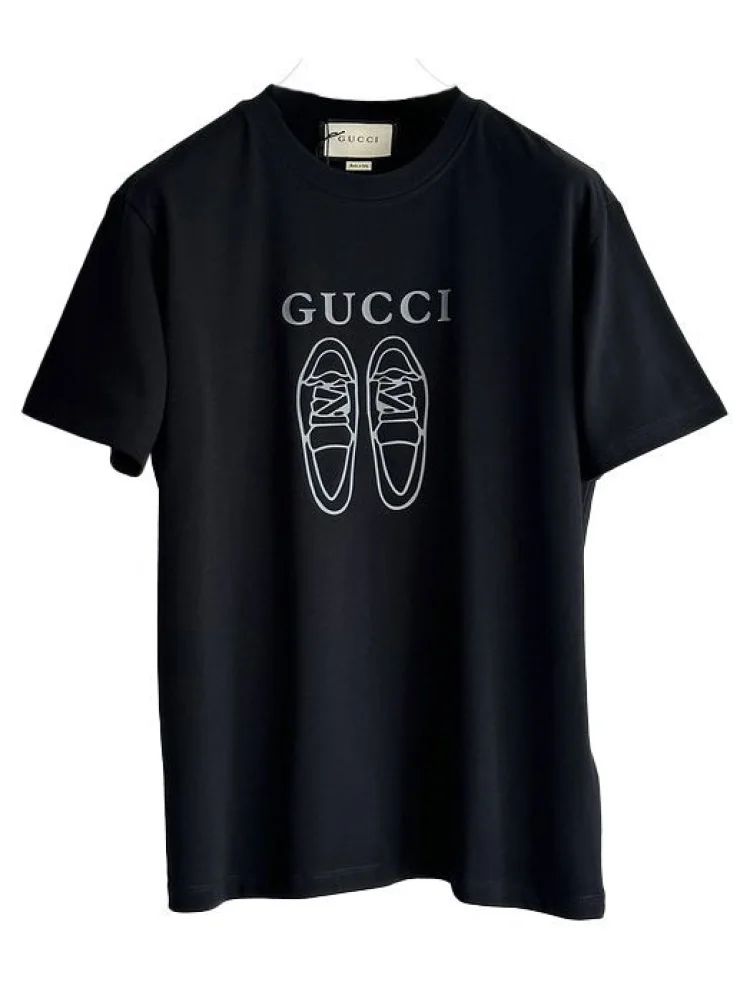 - Оригинальный принт: принт логотипа Gucci и обуви делает футболку узнаваемой и стильной.