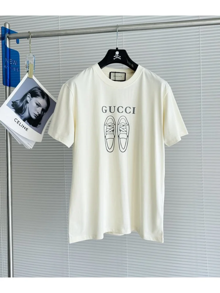- Современный дизайн - футболка декорирована логотипом Gucci и принтом "Shoes And Logo", что придает ей элегантности и уникальности.