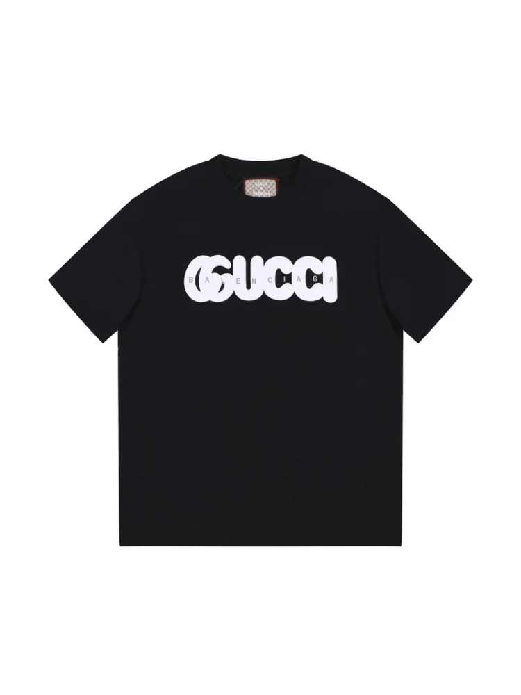 - Современный дизайн: сочетание логотипов Gucci и Balenciaga придает футболке современный и стильный вид.