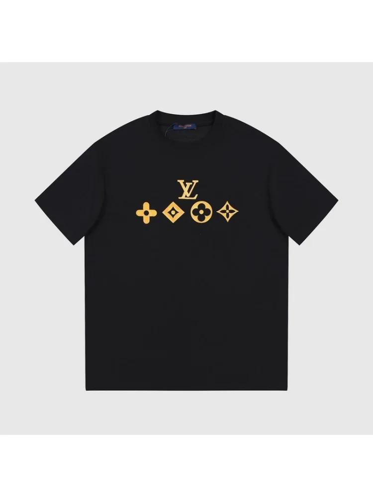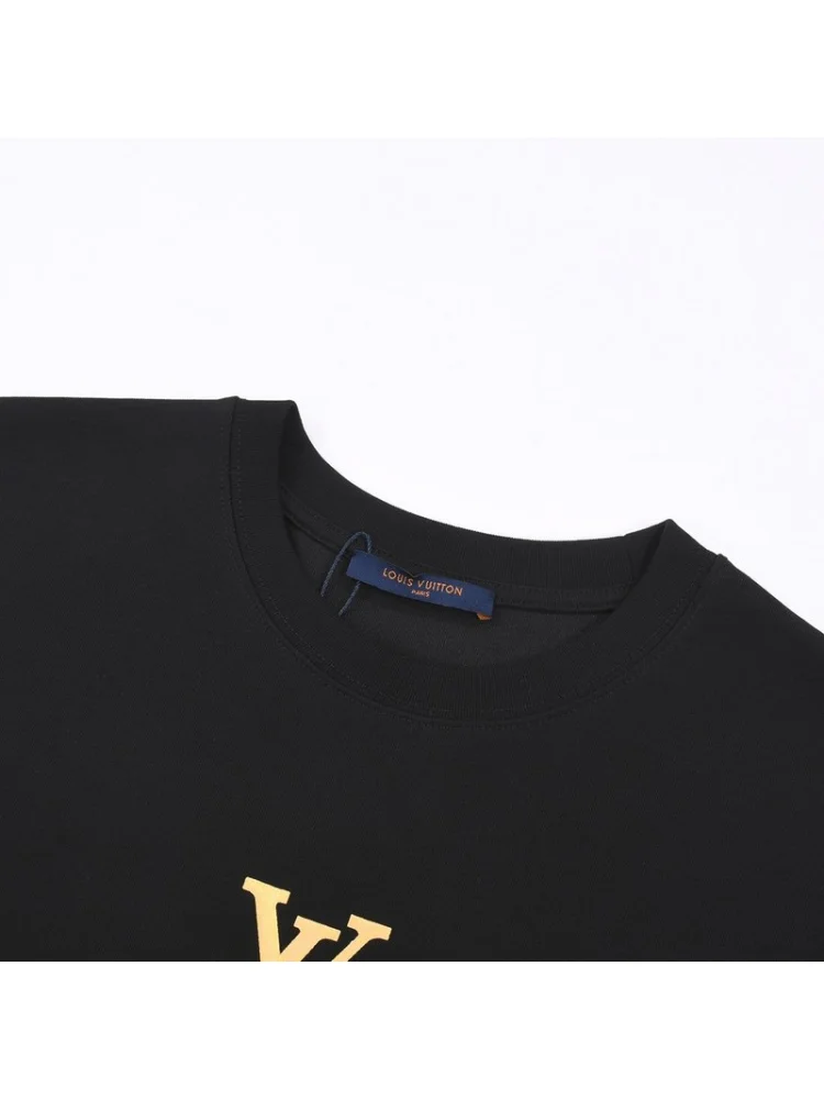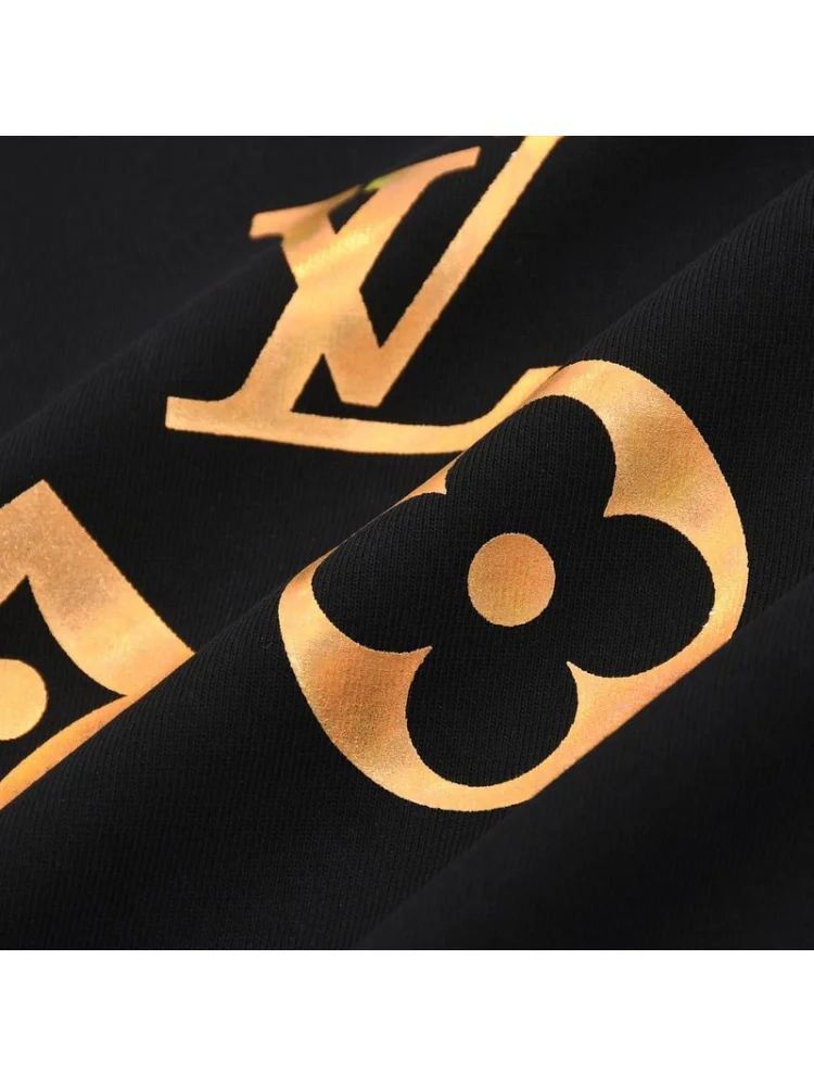 - Стильный дизайн: Принт с золотым логотипом Louis Vuitton делает эту футболку модным и элегантным предметом гардероба.