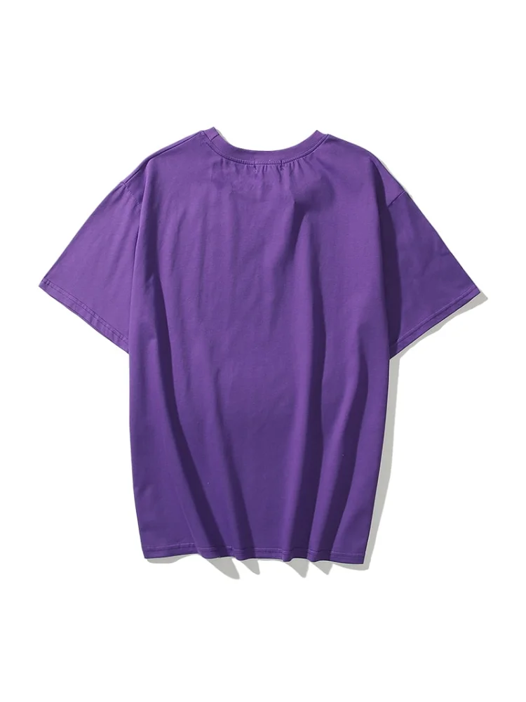 - Яркий цвет: фиолетовый цвет футболки привлекает внимание и добавляет яркости в образ.