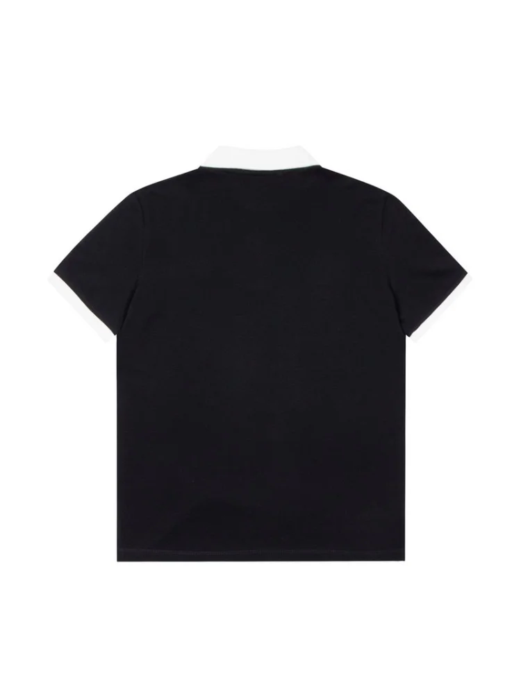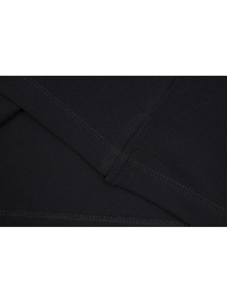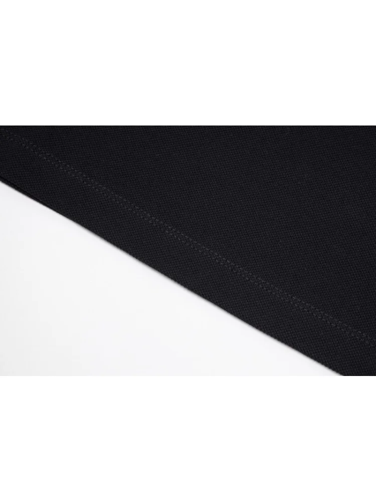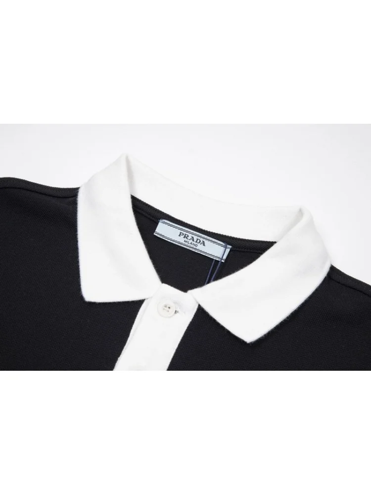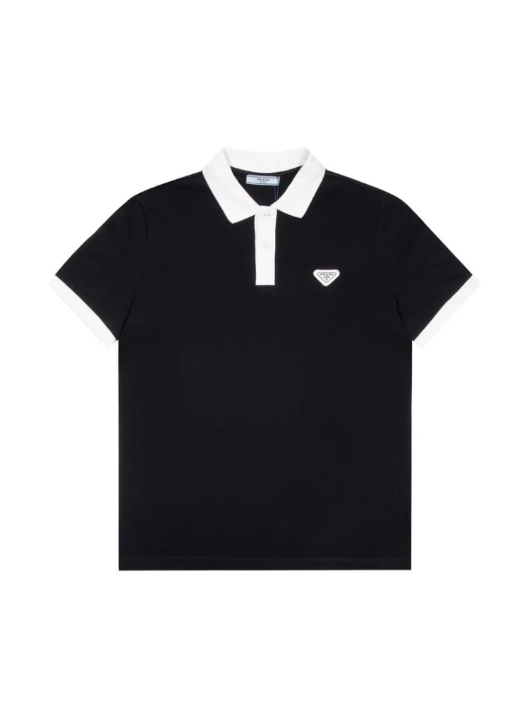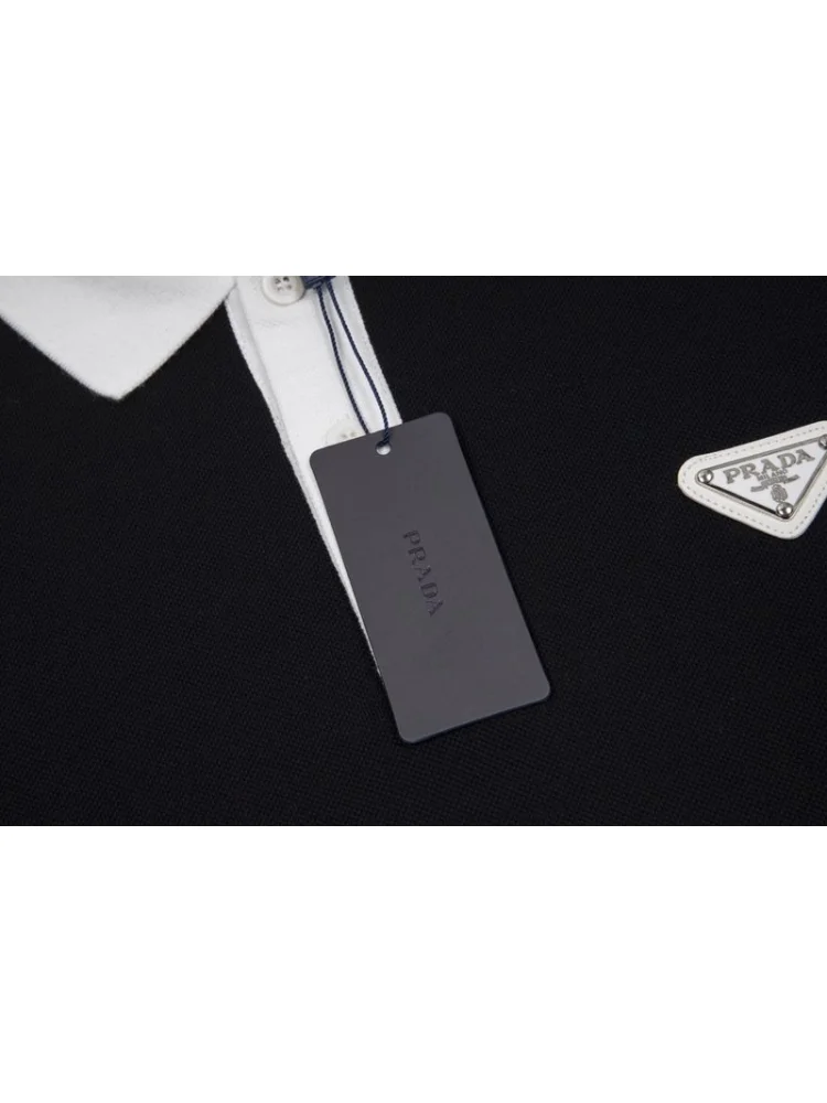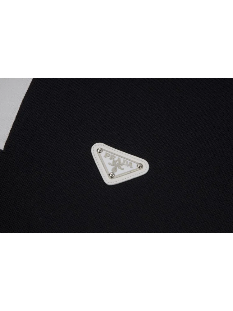 - Стильный дизайн: поло имеет элегантный черный цвет и выразительный кожаный логотип Prada, что делает его привлекательным и модным.