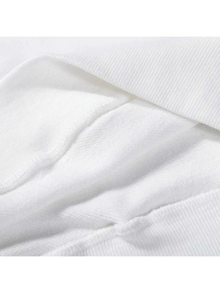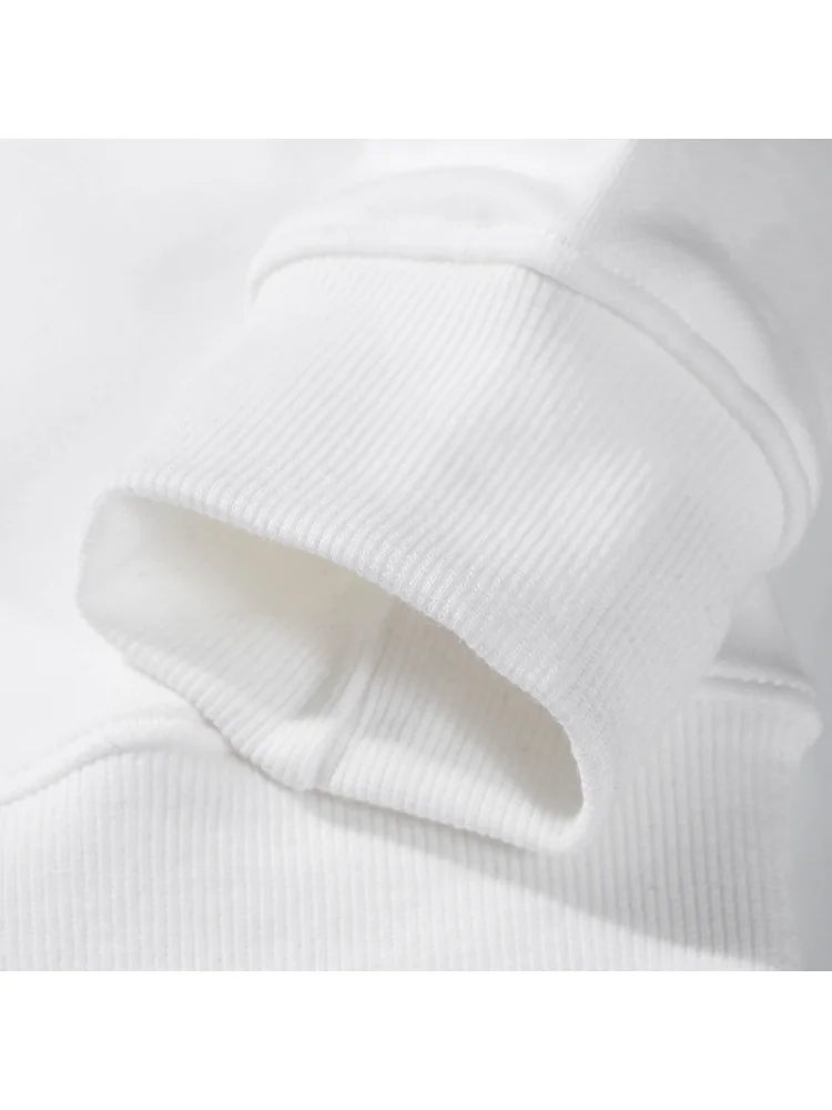 - Универсальность: белый цвет и классический дизайн позволяют легко сочетать этот свитшот с различными стилями и аксессуарами.