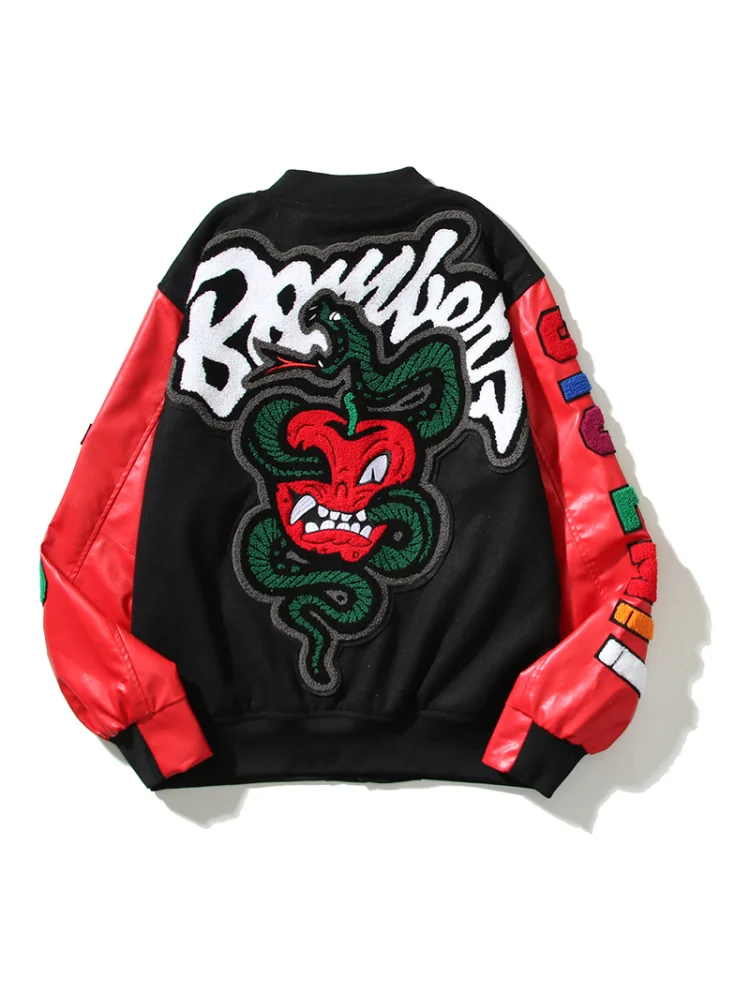 - Уникальный дизайн - куртка украшена яркой змеиной аппликацией и ярким красно-черным цветом, что придает ей особую привлекательность.