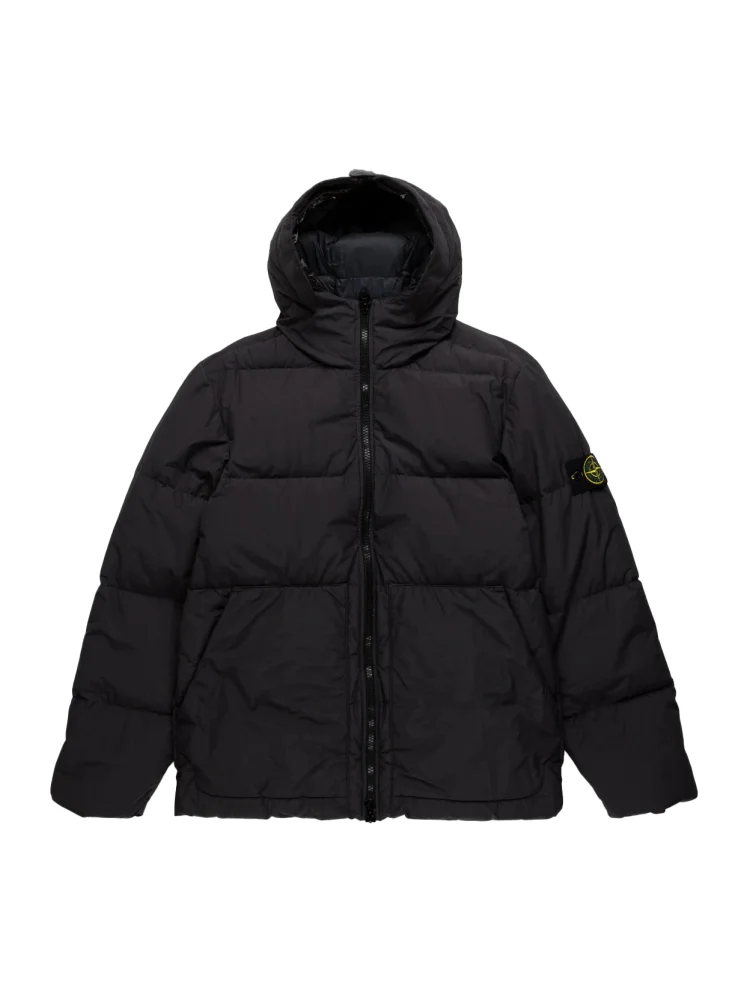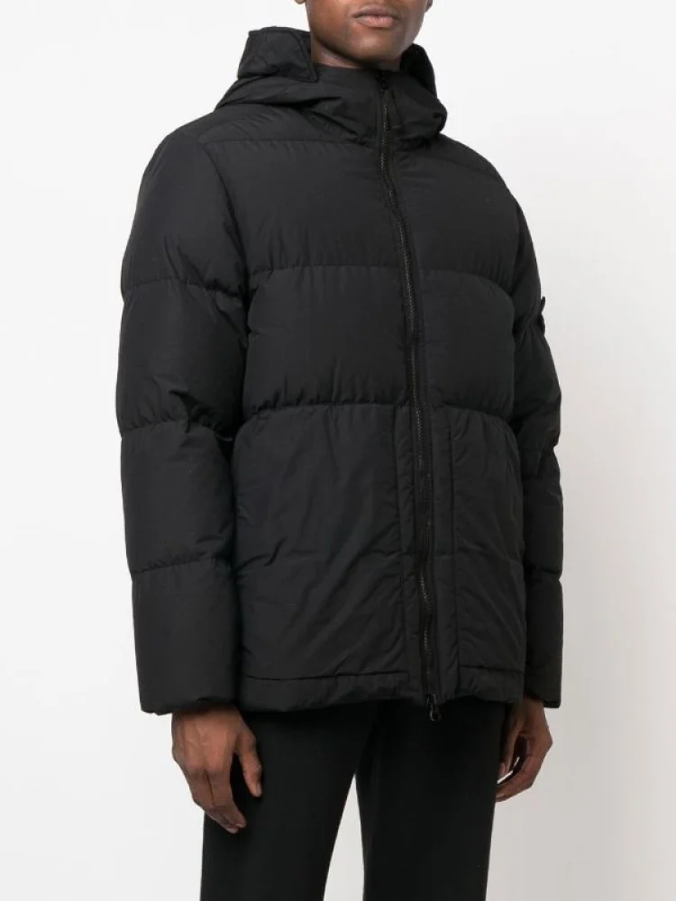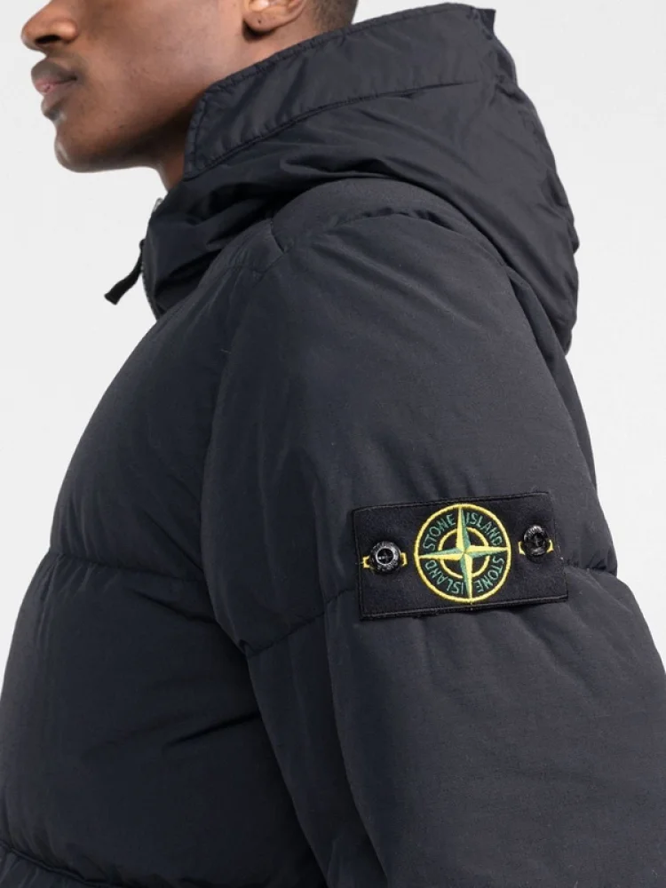 - Стильный дизайн: классический черный цвет и детали в стиле Stone Island делают этот пуховик модным и стильным.