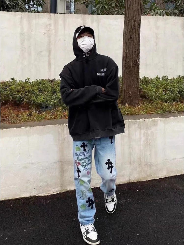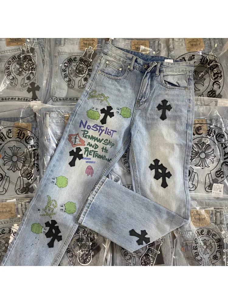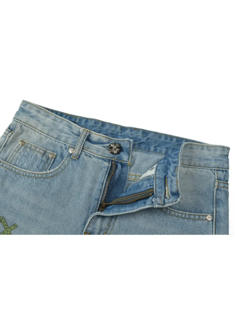 - Стильный дизайн: Кресты и надписи на ткани придают джинсам уникальность и делают их отличным выбором для тех, кто хочет выделиться из толпы.