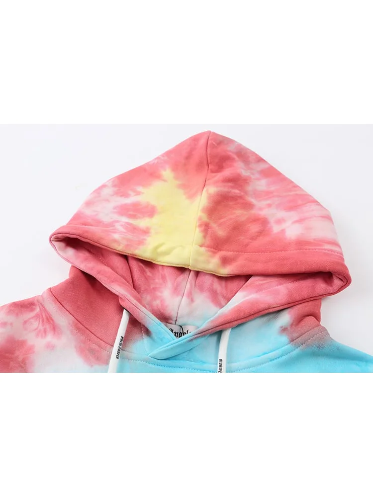 - Уникальный дизайн: худи имеет яркий и запоминающийся принт в виде письменной надписи, выполненной в технике тай-дай, что придает ему оригинальный и стильный вид.
