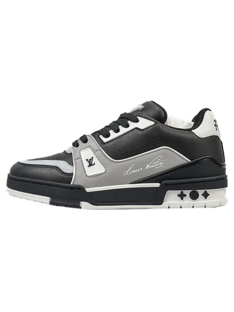 - Изысканный дизайн: кроссовки имеют элегантную черно-серую расцветку с подписной логотипом Louis Vuitton, что придает им стильный и роскошный вид.